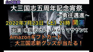 大三国志 五周年記念宵祭〜勇往邁進〜 ◎日時 2022年7月23日(土)21時開演 ◎開催場所 マサヤンXのYouTubeチャンネル ◎...